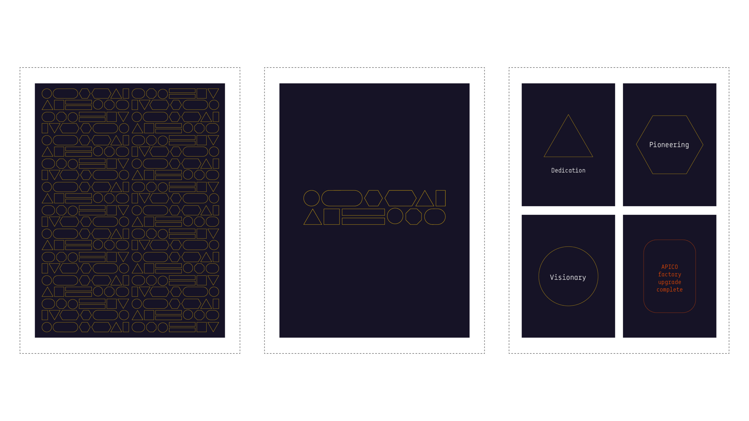 The following graphic shapes are the graphic components for the APICO brand. The shapes are abstract representations of the wide range of forms that can be made by APICO.