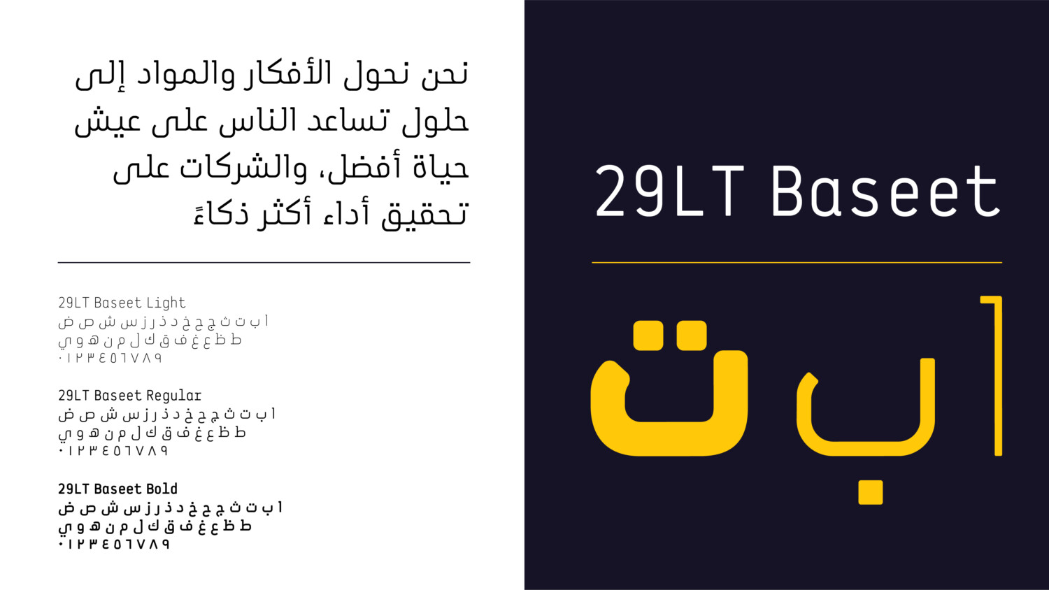 Typography should always be implemented in a clean and structured manner. Particular attention should be given to the weights used for body copy and headlines. 29LT Baseet is the brand font and is to be used for both Latin and Arabic languages. The typeface is available in multiple weights, allowing for the building of hierarchy across different types of information for example in information graphics or illustrating abstract or complex business concepts.